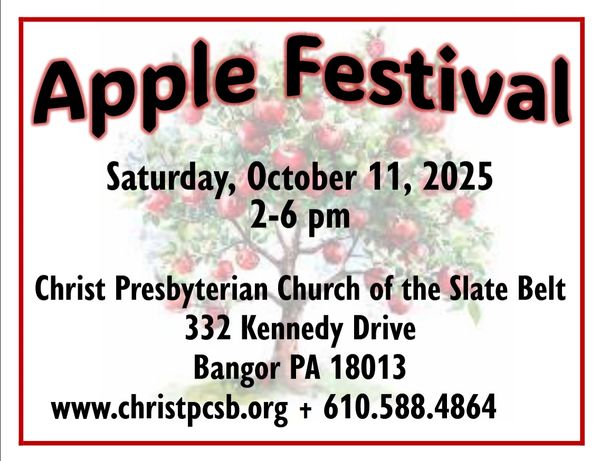 Saturday, October 11, 2025 2-6 pm Christ Presbyterian Church of the Slate Belt 332 Kennedy Drive Bangor PA 18013 www.christpcsb.org 610.588.4864